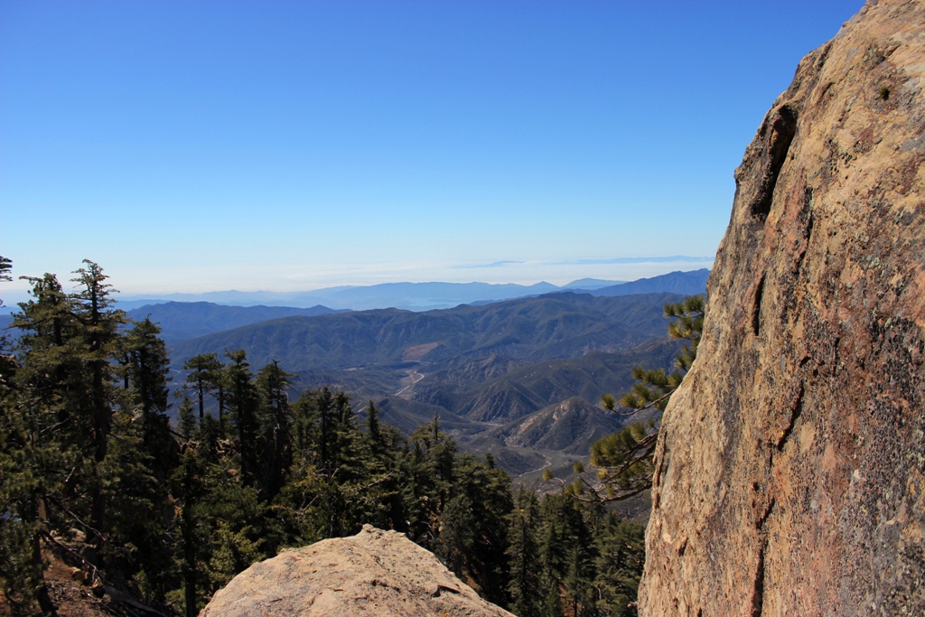 View from Haddock Peak. In the distance the Pacific Ocean can be seen blanketed in fog with Santa Cruz Island just visible on the horizon.
