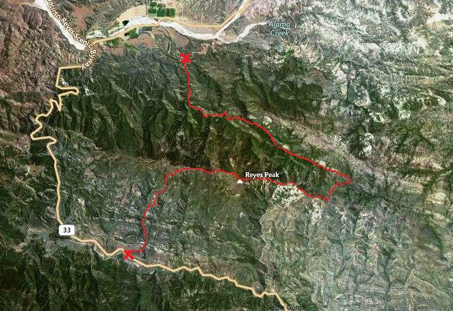 - Chorro Grande Trailhead (4000′) — Reyes Peak (7500′) — Haddock Mountain (7400′) — Camp Scheideck Trailhead (3800′)
