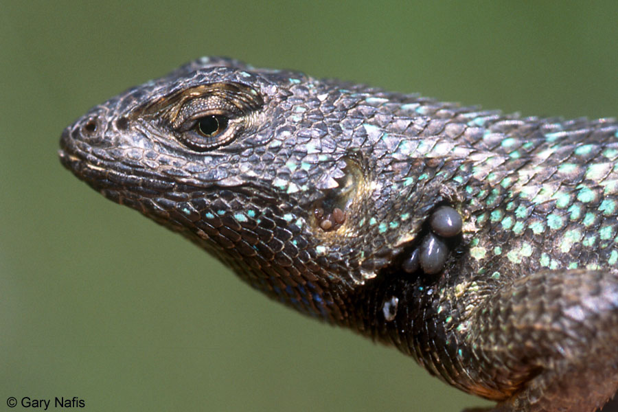 Engorged ticks feeding on a western fence lizard or “blue belly.”