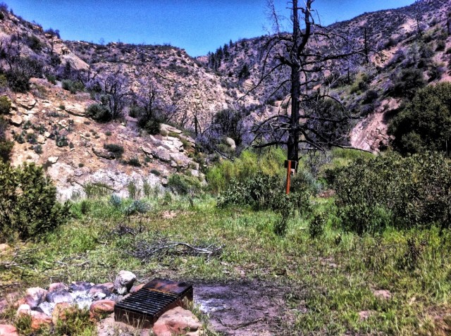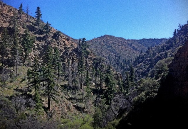 The majestic needle-leaved sentinels overlooking rocky, cave-riddled mountainsides adds an enchanting feel to the land. The trees in lower Rancho Nuevo Canyon survived the fire preserving the characteristic ambiance of this particular stretch of the canyon. And a patch of forest surrounding Mine Camp remains in otherwise burned out hills. In much of the wilderness, however, the alluring character the conifers added to the land went up in smoke.