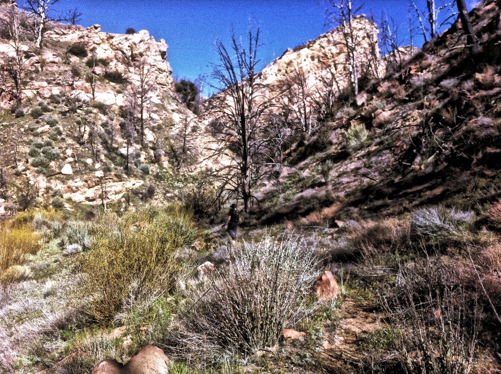 After a wildfire plant life rapidly returns. The bushes, scrub brush and chaparral, it all grows back relatively quickly, along with weeds galore. Of course, fire or not, the various sandstone outcrops lining canyon walls will always remain. But without towering big cone Douglas fir trees clinging to the rocky slopes, the characteristically stark Dick Smith Wilderness feels especially barren and empty.