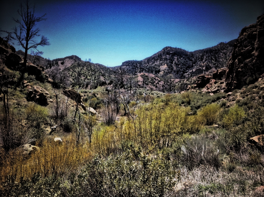 As I walked past pockets of dead trees and peered up at cragged mountainsides patchily covered in them, I was left to imagine what it all looked like when the blackened, leafless trunks were alive and green before the fire. I had not hiked either trail before, never seen the area.