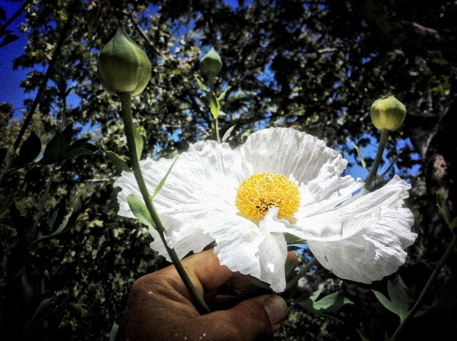 The wildflowers are bloommin’ out there right now and Matilija poppies are poppin’. I snapped this iPhone photo at Santa Barbara’s Oak Park yesterday afternoon.