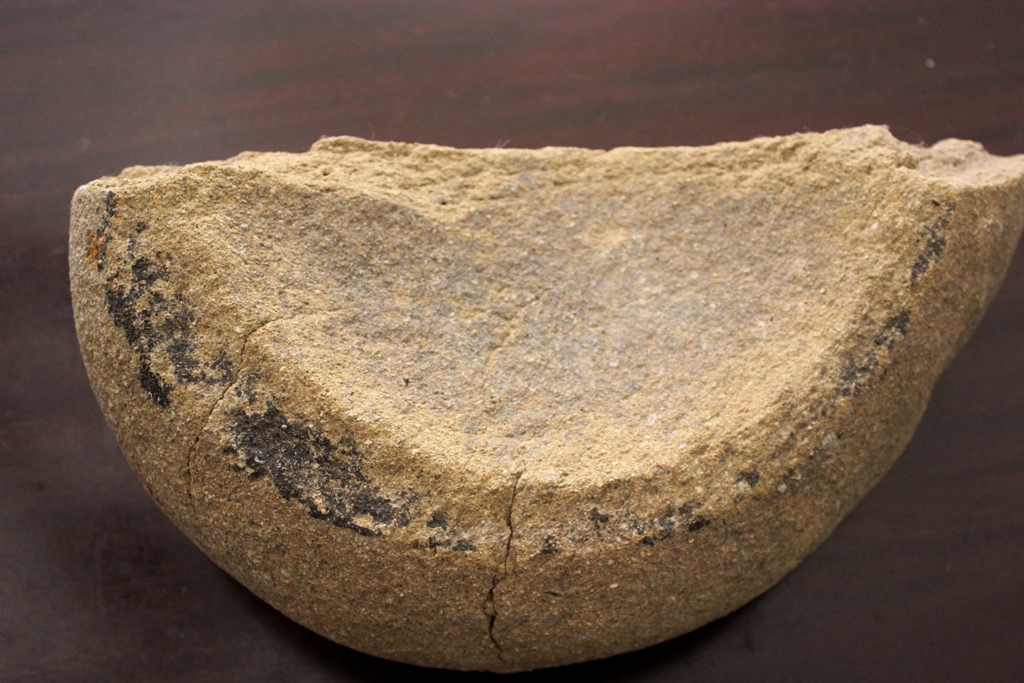A remnant half of a basket hopper mortar with the faint black stain of asphaltum still visible around its edge.