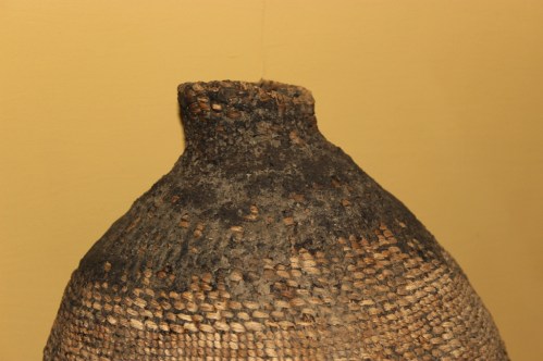 Asphaltum sealed Chumash water bottle on display at the Santa Barbara Natural History Museum.
