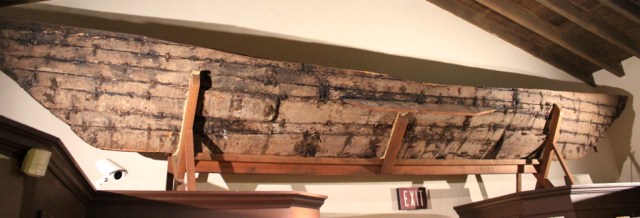 A wood plank Chumash canoe, or “tomol,” caulked with a mix of pine pitch and asphaltum, called “yop” in their native language. The canoe was built in 1912 under the direction of 73 year old Fernando Librado Kitsepawit (b. 1839-1915), the last full-blooded island Chumash. The canoe is displayed at the Santa Barbara Natural History Museum.