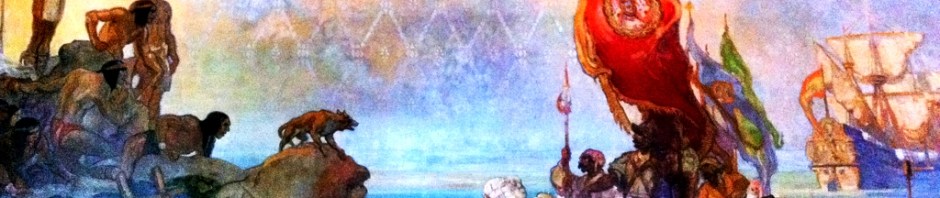A mural depicting Cabrillo meeting the Chumash, as seen inside the Santa Barbara courthouse.