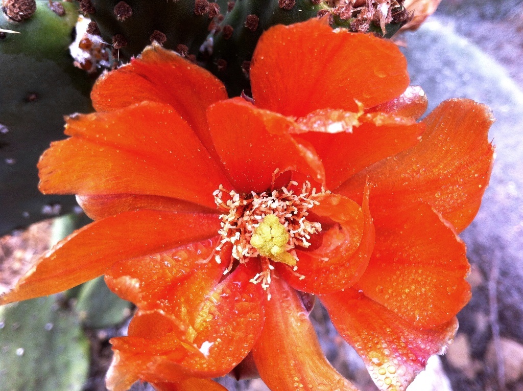 This bloom was on a clump of prickly pear paddle cactus that grows just above the top pool at Seven Falls. I believe it is a native cactus of genus Opuntia.