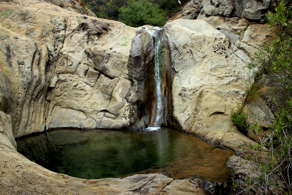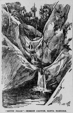 Mission Falls (Mission Falls is the waterfall mentioned but unnamed in the above opening quote from 1889: “At the head of the canyon is a large rock over which the water leaps with considerable force in the rainy season. This fall can be seen from the city.”)