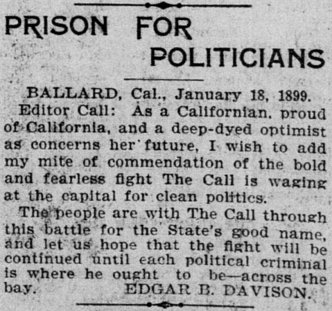 Davison participated in party politics and in 1898 was elected a delegate in the Republican county congressional convention. The next year the San Francisco Call published a letter he wrote commending the newspaper for its “bold and fearless fight” against political corruption in California. In 1911, President Taft appointed him postmaster of Ballard.