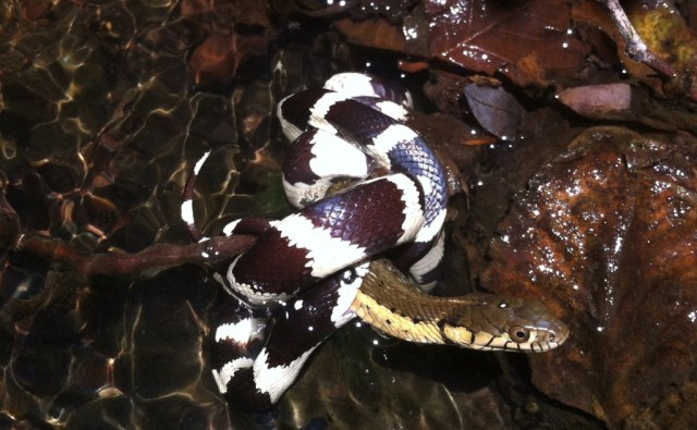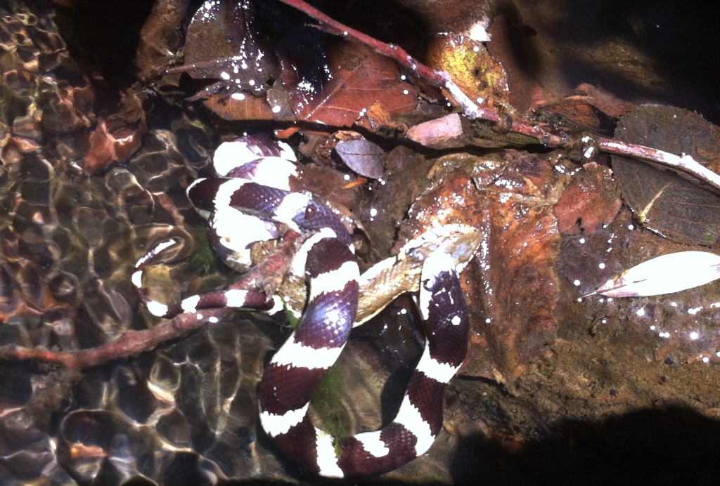 So awesome! I once came upon a California King Snake with a Rattlesnake half-way down its gullet in a similar setting: the middle of a crossing on Matilija Creek. I was also bitten by one once when I got a little clumsy snatching it up from a bed of leaves to show some students. If you’re ever lucky enough to see a Mountain King Snake, that’s a beautiful sight. Love your blog!