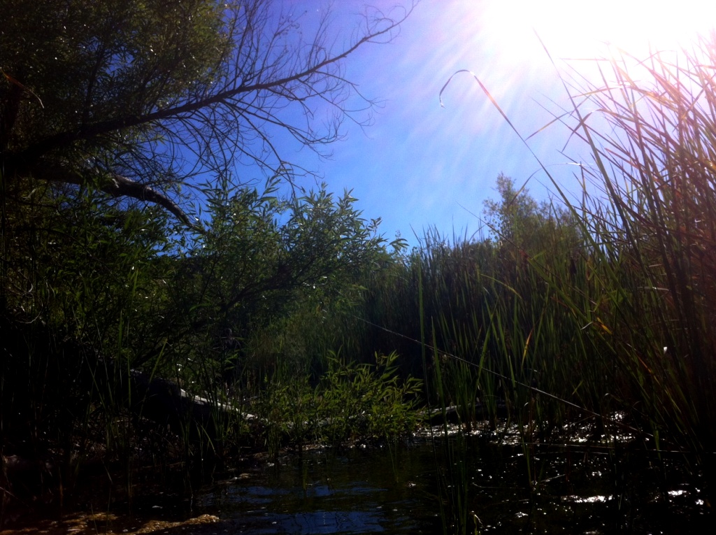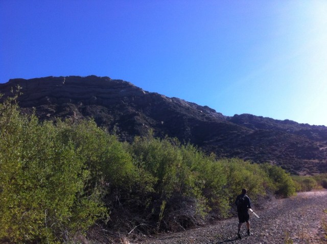 The first stage is comprised of the distance between Cherry Creek and Tule Creek, which measures, I don’t know, about eight miles. (Yes, for the sticklers reading this, we are aware that this does not officially count as the beginning of Sespe Creek.) This portion includes, at this time of season, open and sun-blasted dry gravel washes fringed in chaparral and descends into the deep shade of lush riparian habitat beneath fir, alder and cottonwood trees and amidst bushy willows. The stream intermittently running cool, sitting mossy and stagnant, choked in thick reedy flushes of pollen spewing cattails or dry lumpy beds of hard water stained boulders. And so it begins. . .