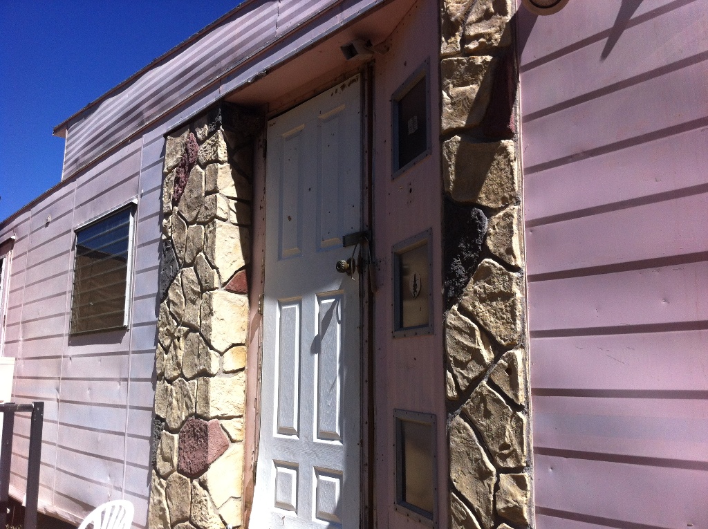 Nothin’ spruces up a battered old trailer home beside the creek like a stone facade entrance!