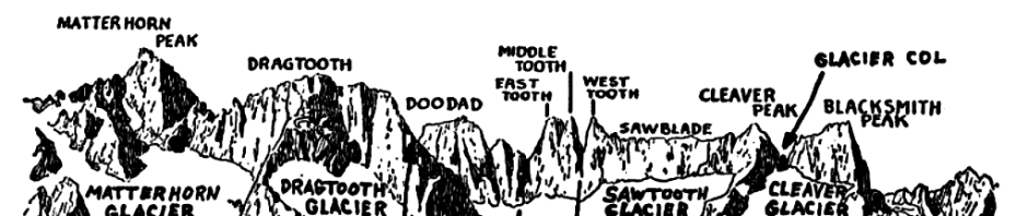 Some of its notable features include, from left to right, Matterhorn Peak (12,281), Cleaver Peak (11,850), Blacksmith Peak (11,850) and Eocene Peak (11,555).