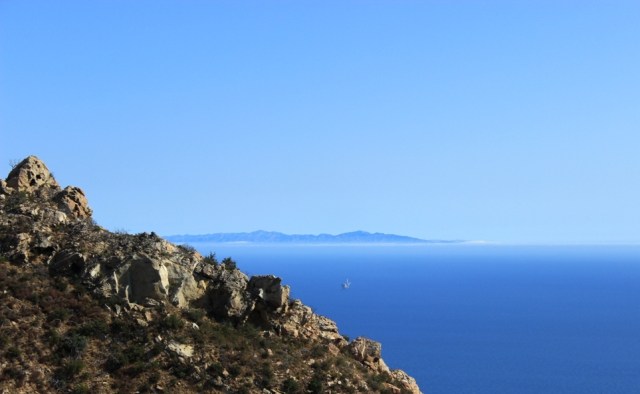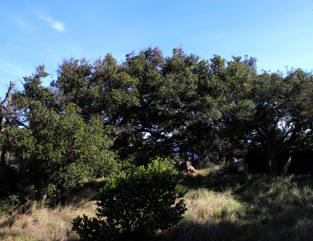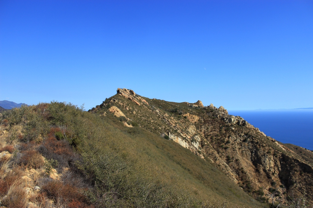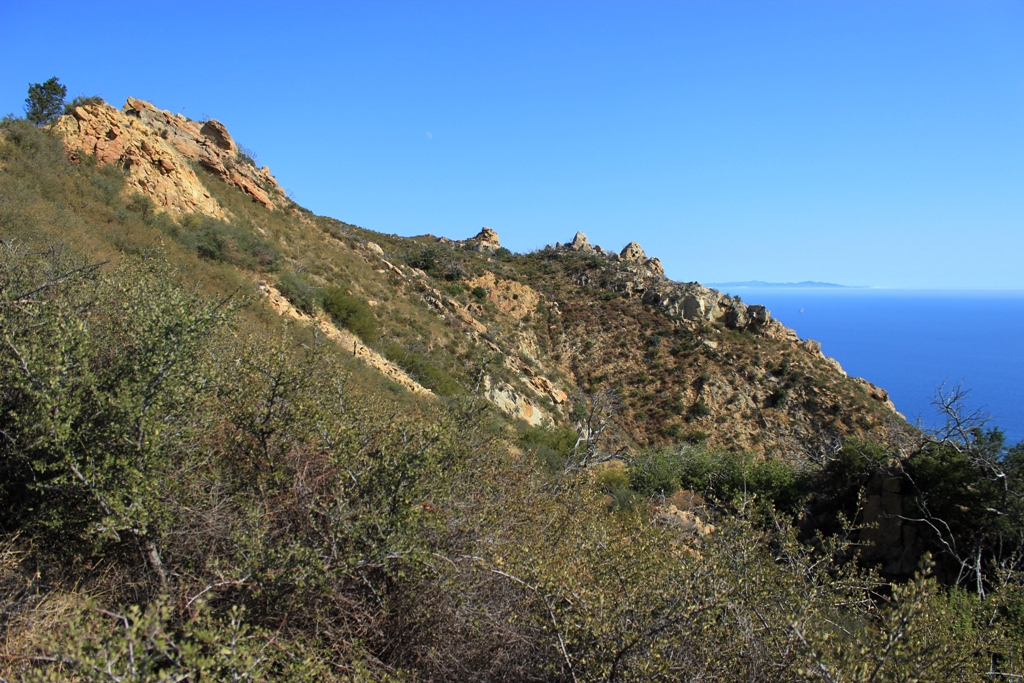Stepping through the few oak trees that cover the shaded flat or climbing up a few feet of the outcrop reveals a sweeping toes-over-the-edge view of the Pacific Ocean a thousand feet or so below. In late afternoon the sun’s glare reflects off the ocean like a mirror and blasts the south facing mountain slopes with especial intensity.