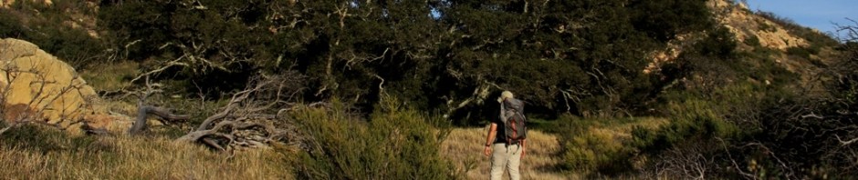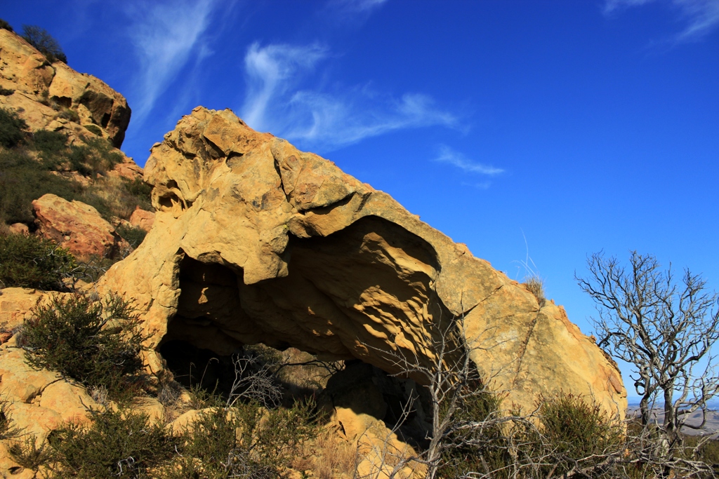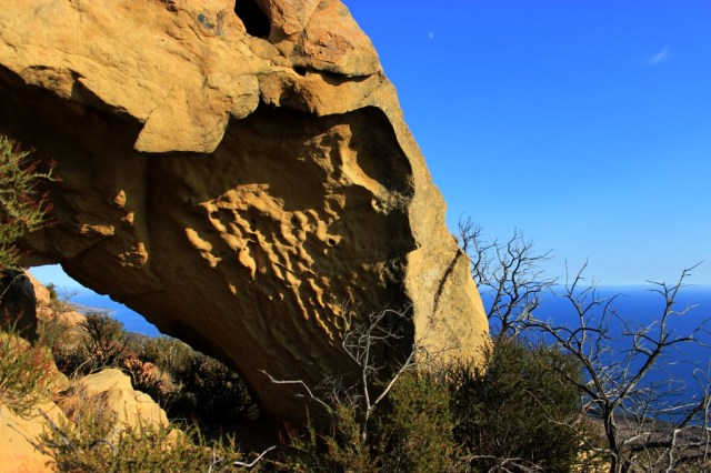 I hiked to the two arches amid the rocky crags of the Gaviota Coast. Along the way on the ridgeline leading to the arches, there is a mountaintop grassy flat shaded by a few gnarled, lichen covered oak trees that are tucked up against a sandstone outcrop. The wind sucks over the narrow rock-studded ridge with a degree of force and regularity that is plainly revealed in the slanted angle at which the oak trees grow. And the leafless branches stripped bare on the windward side of some plants.