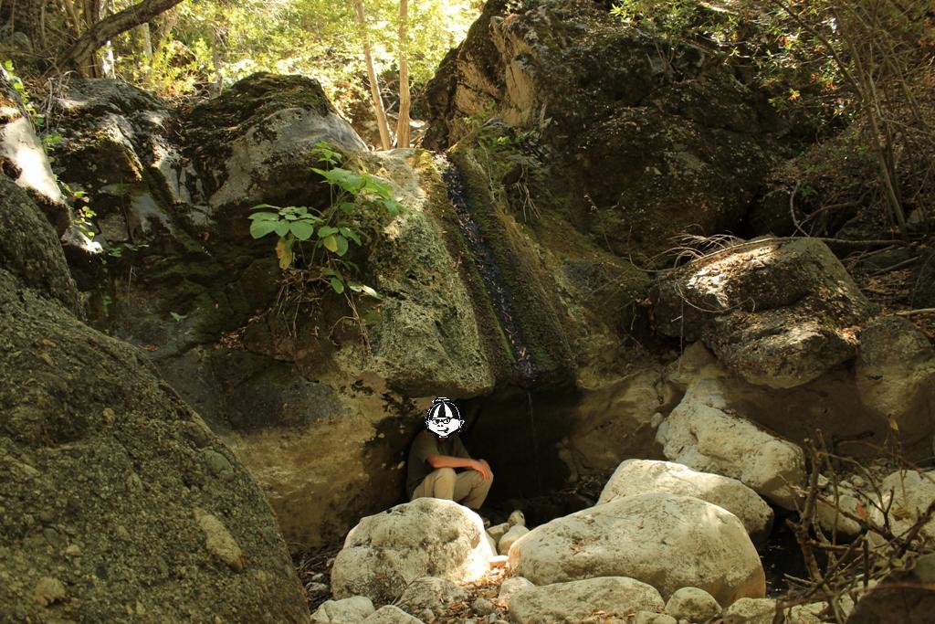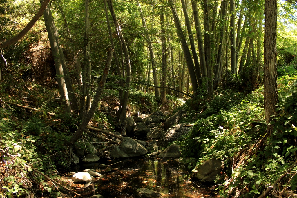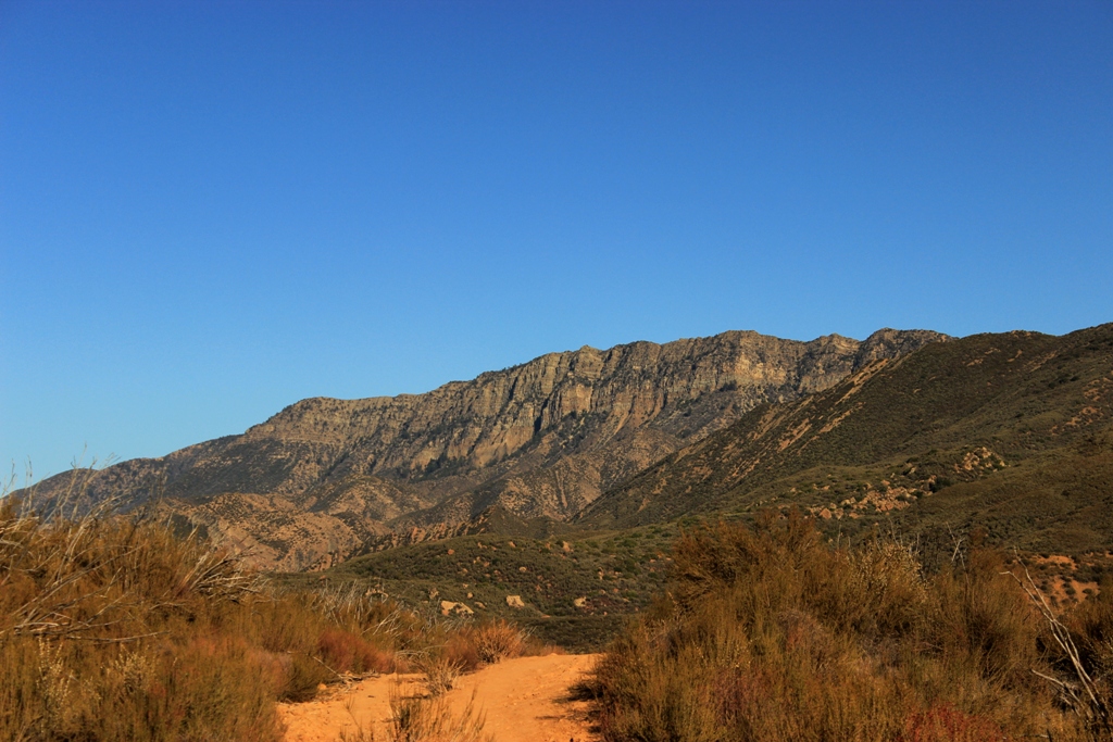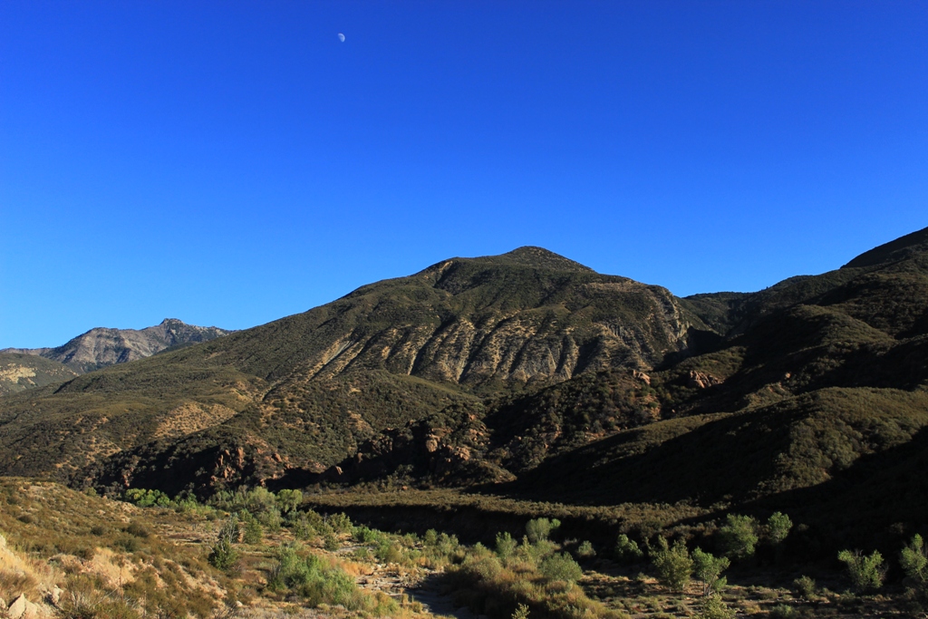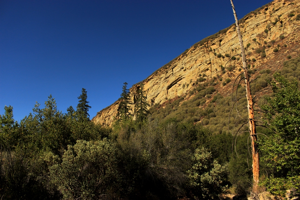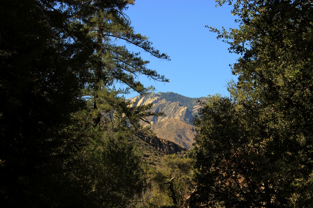 Bear Canyon creek cuts a narrow gap through the foot of the mountain towards its confluence with Sespe Creek. It’s a canyon patchily shaded by oak, maple, sycamore, alder and fir trees, with a couple of looming cliffs rising high overhead, and a seasonal creek that flushes through sections of massive boulders.
