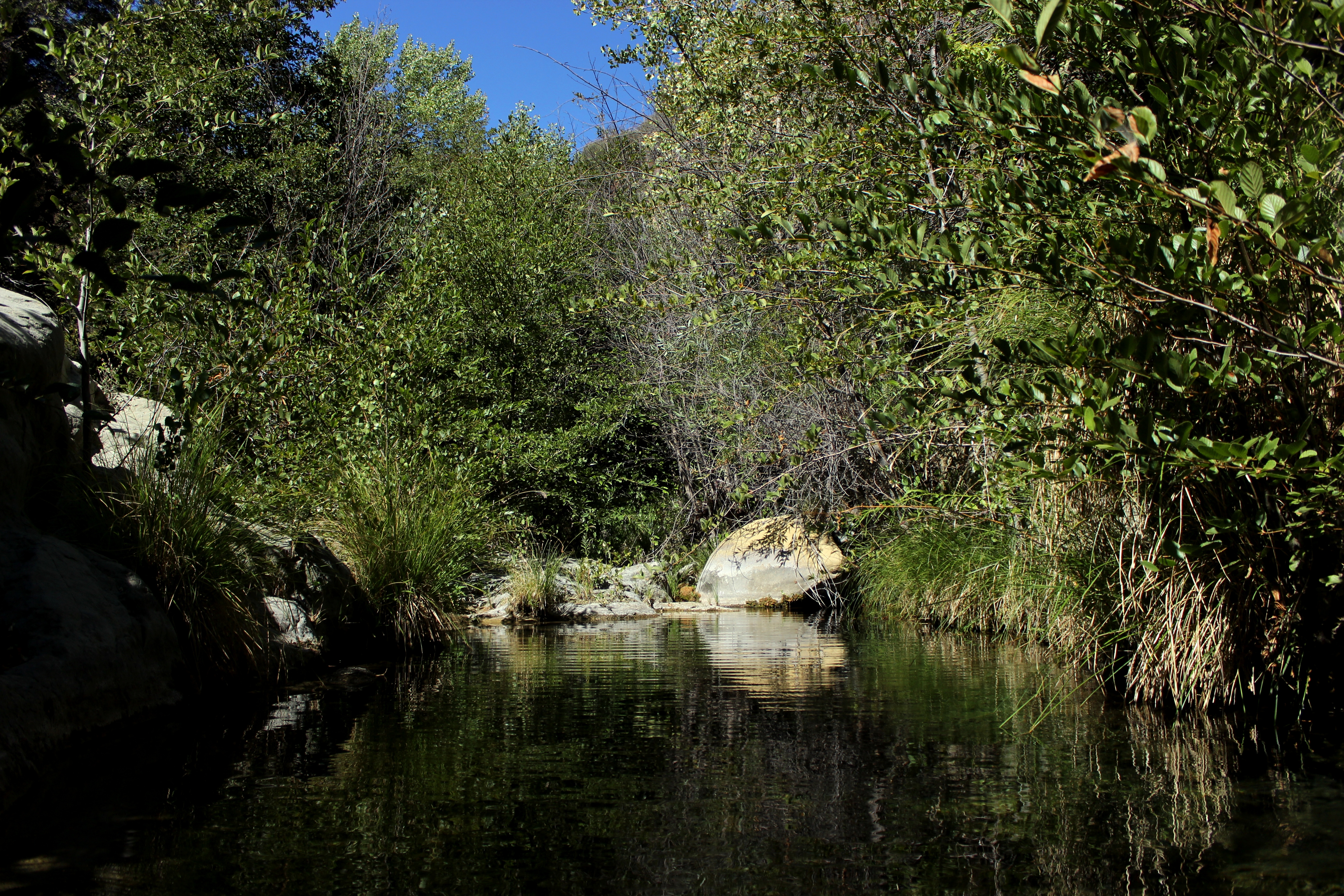 Slinking quietly into the canyon mouth with deliberation, I waded slowly into several thigh to waist deep pools of still water, the ripples lapping the creek banks sounding like the gentle slap of water against a boat hull. After the first four miles of trail, under that deadly sun and through the chaparral above and along the dry Sespe, Bear Canyon was a welcomed shady oasis with cool, clear flowing water.