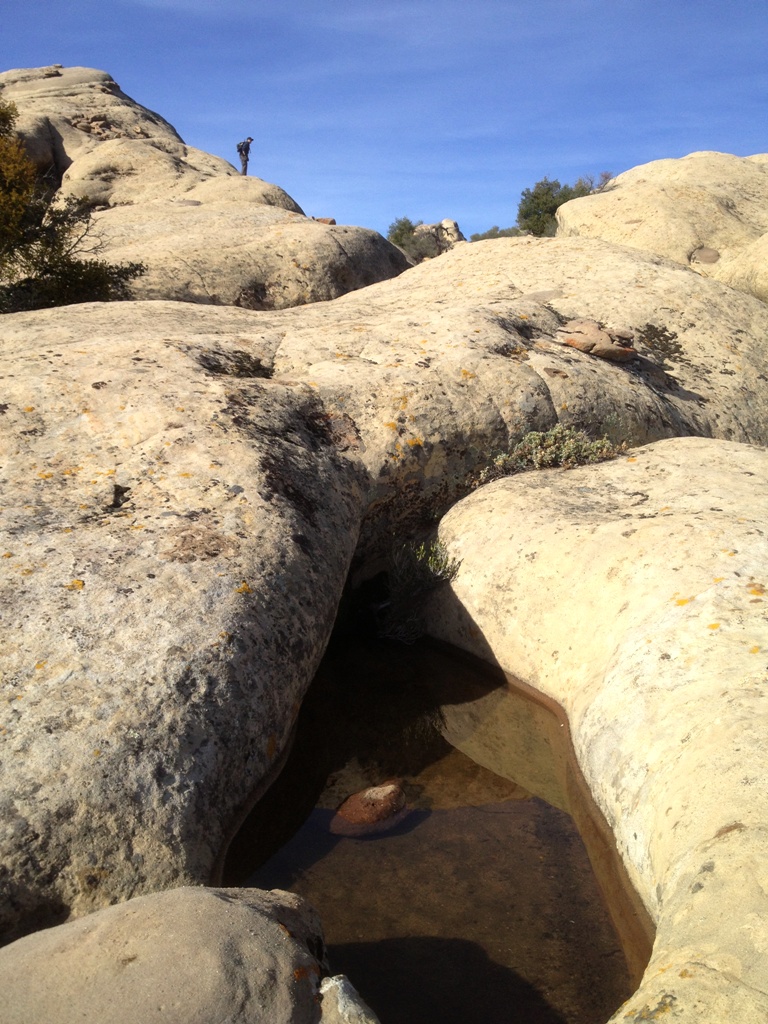 On our ascent Stillman spotted a mountain lion print in the sandy dirt amid the rocks near the rope section through the steep rocky slot. On our way back we noticed lion prints in several locations as they followed the ridgeline. It’s quintessential lion territory up there.