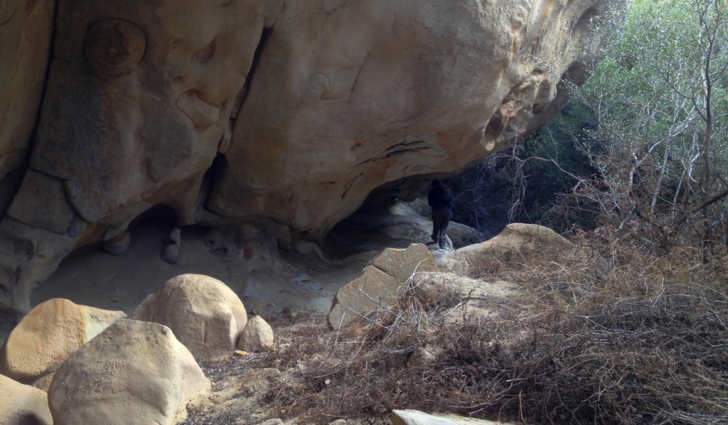 Whiteacre 7The deep cleft between the bedrock formations just beside and below the peak. To the right of the chaparral rises another massive wall of sandstone that leads to the summit.