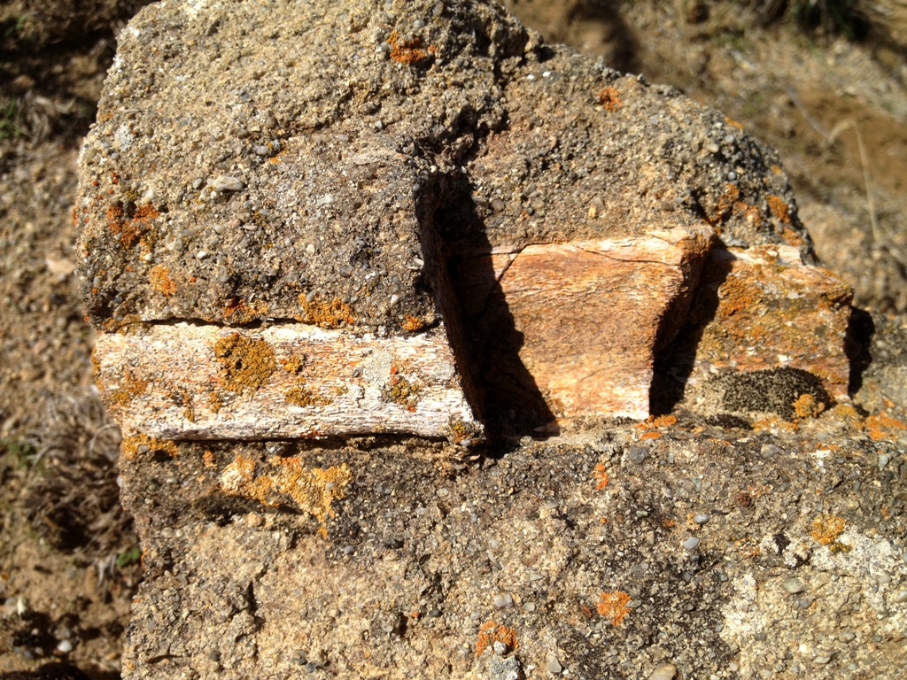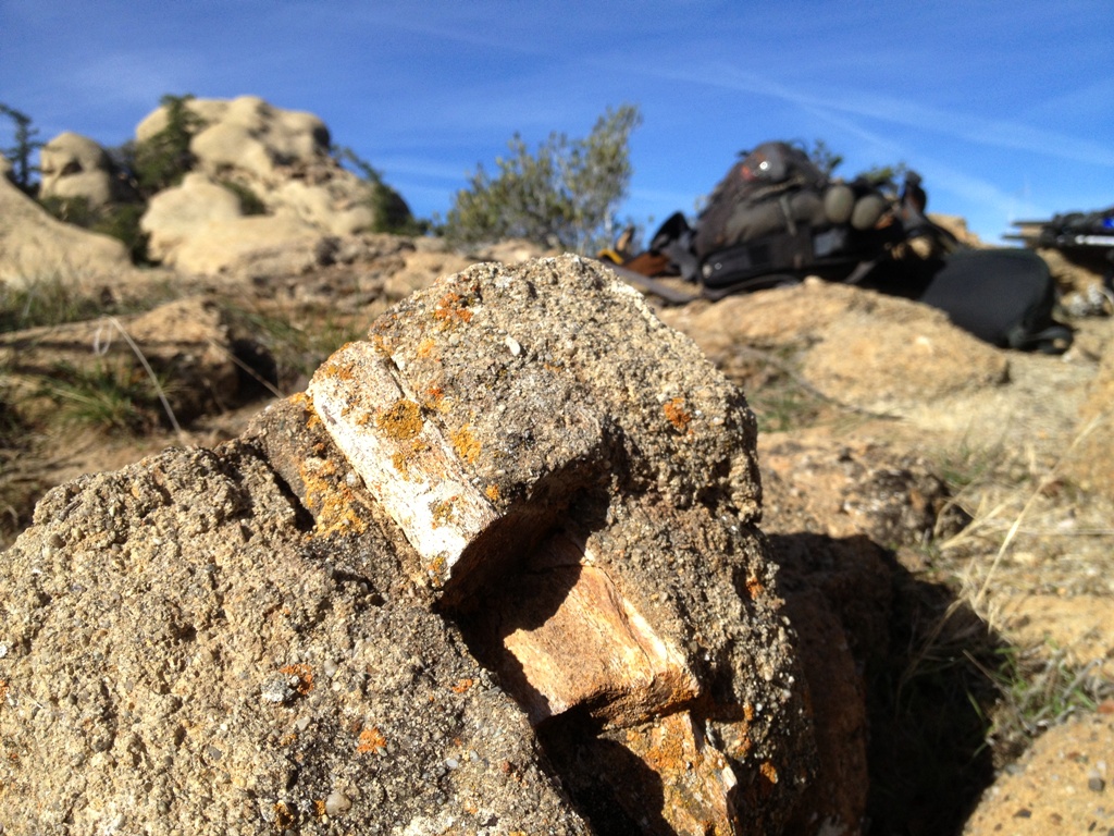Having left Whiteacre summit we sauntered back down the rocks and picked around checking the place out for a bit. Stillman went his way, I went mine. Sometime later Stillman called my attention to a fossilized bone he had found. Looking around the area we found several other chunks of fossilized bone.