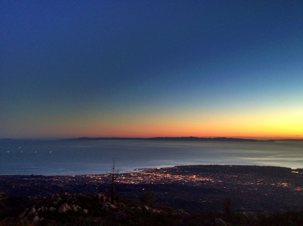 I have no idea where the trail is other than it’s somewhere close by lost in the deepening darkness. I do know with absolute certainty, however, that the ridge leads to the road. If I follow the ridge for a couple of hundred yards it will lead me to the road just a short walk below where I parked. When it gets totally dark, only a crescent moon rising but not until well after 11 pm, and I can no longer see much of anything, I plan to guide myself along the ridgeline by referencing the lights of Santa Barbara far below on the coastal plain.
