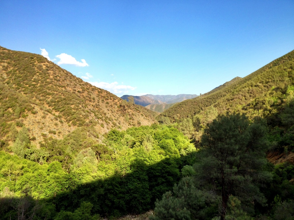I march over the crest of a chaparral covered hill and down into a lightly wooded grassy glen, eagerly looking forward to another rest in the shade. The odd patch of sloping grass on the brushy mountainside is sparsely dotted with oak trees casting big shadows.
