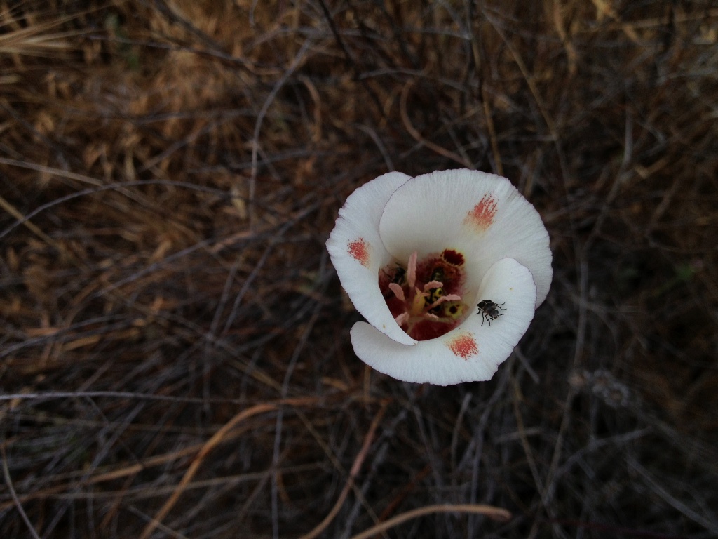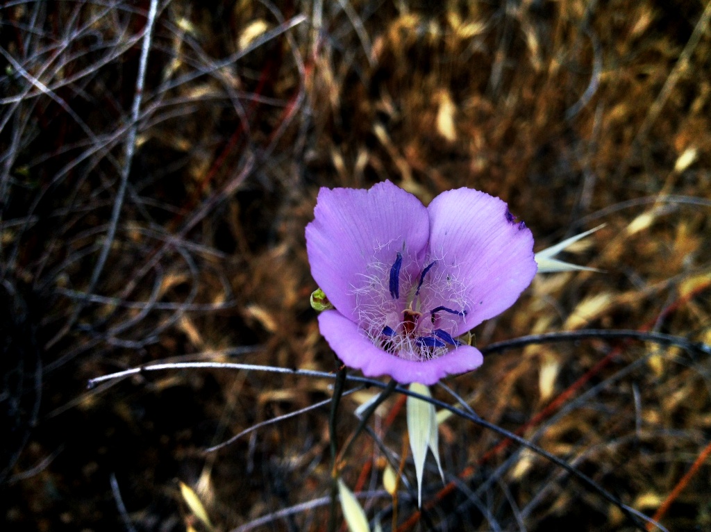 I come upon a scant patch of shade under an overhang of brush. The shadow falls over a small trailside slope of bare soil. I collapse onto the dirt, scrunching myself up against the shadowy foot of the chaparral and trying to escape the sun’s deadly wrath.