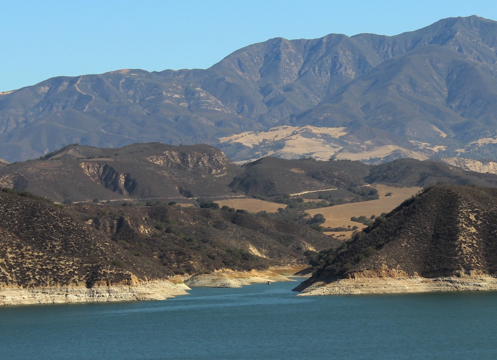 Cachuma Lake Bradbury Dam droughtCachuma Lake at Bradbury Dam, September 2013. The reservoir is well below the floodgates and currently less than half full.