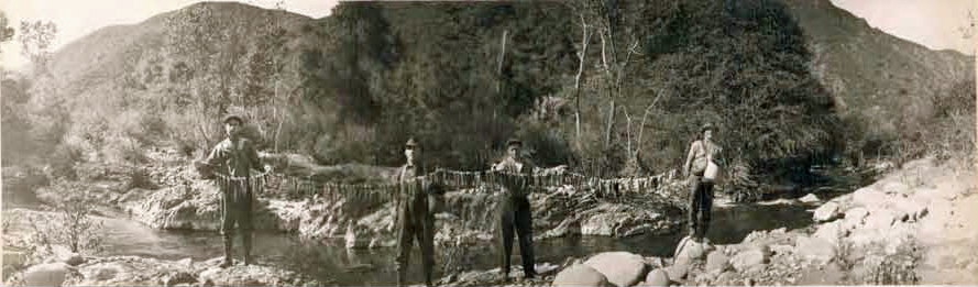 Stringer_of_Steelhead_Trout_Upper_Sisquoc_River_1916Fishermen displaying their catch, or plunder depending on your perspective, along the Sisquoc River (1916). The waterway is now an officially designated Wild and Scenic River. Fishing is no longer legally allowed in an effort to protect native southern steelhead, which are an endangered species and cling to existence today at about one to two percent of their former population size.