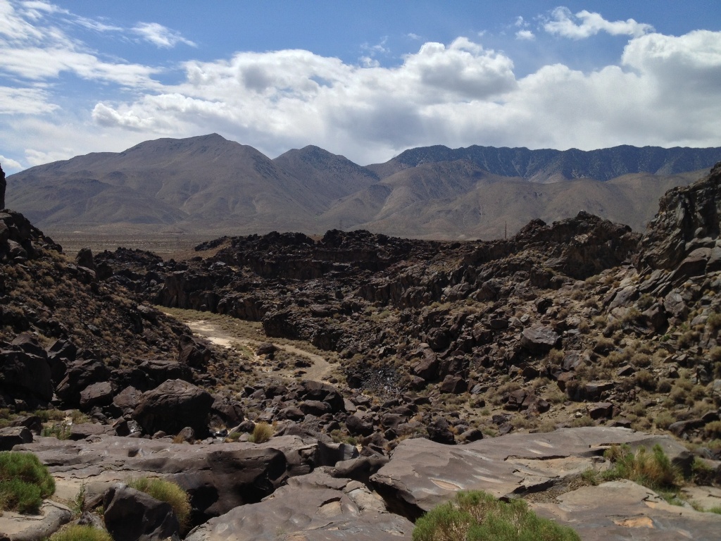 The sign before me describes the richness of a riparian landscape that is the opposite of what exists around me. Men, women and children, I read, carry on life’s daily activities enjoying the natural wealth of a bountiful land of verdure and abundant animal life. I look away from the sign and see heat waves, barren mountain slopes, fields of dark volcanic rock and much bare dirt and sediment with only a meager speckling of native plants that can barely be called scrub brush. The environment here has radically changed since the times thousands of years ago when humans lived along the shores of this now non existent river.