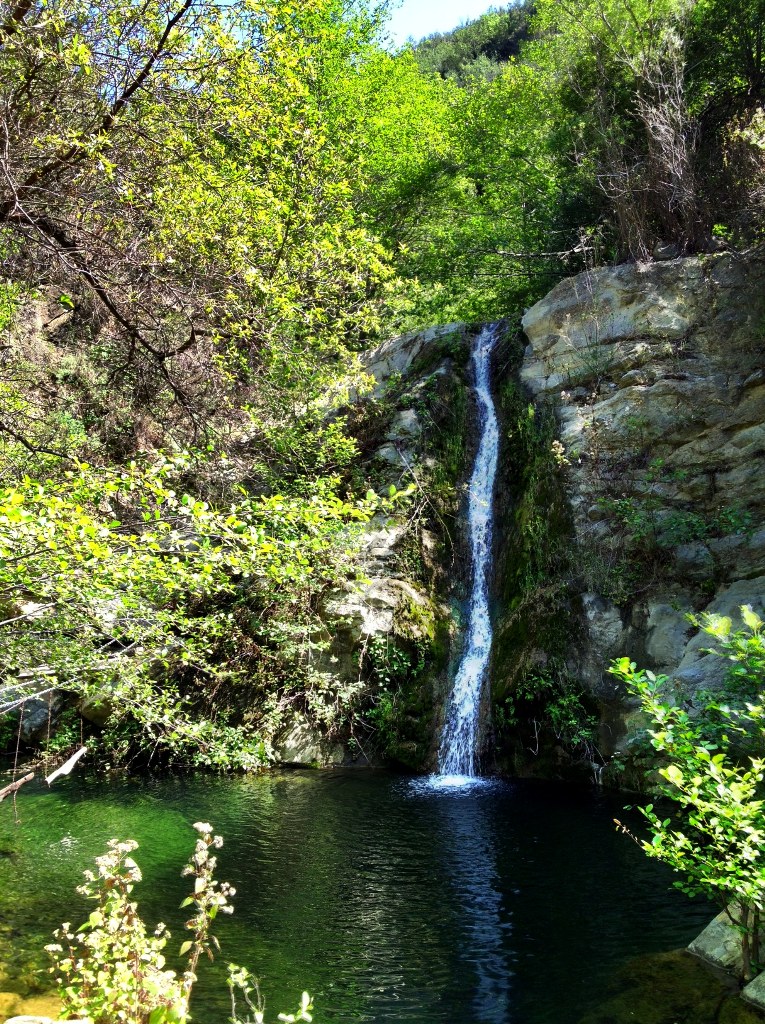 The large emerald pool below Fish Falls might be the best summertime swimming hole on the frontside of the Santa Ynez Mountains in Santa Barbara County. It’s deep enough to dive into from the top of the waterfall, if you’re good, and wide enough for several people to comfortably swim around.