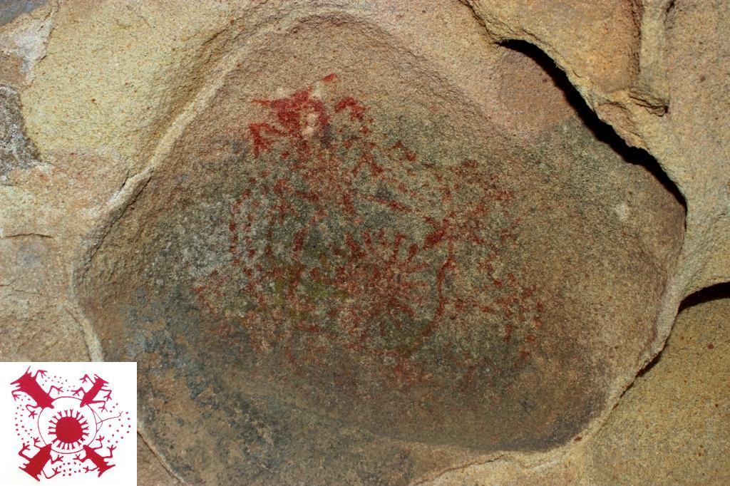 A seasonal creek flows by this Indian rock art site in Santa Barbara County and there is a spring not far from the paintings. When flowing the creek cascades several feet over an exposed outcrop of bedrock and into a small pool near the painted alcove. On the face of the outcrop where the waterfall flows there is a cavity in the rock that catches and holds water for far longer than the pool below the falls.