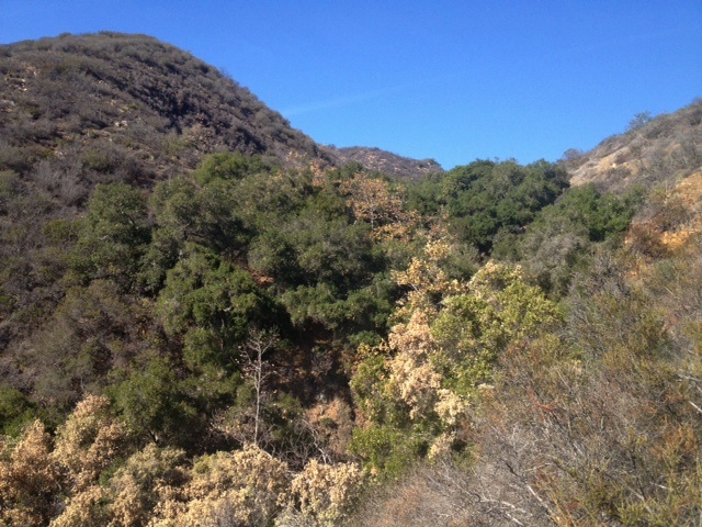 Coast Live Oaks canyon hikeWe had set out to go spearfishing, but a south wind and a west swell combined to ruin conditions. We drove up the mountain from the beach and hiked down into the canyon, the creek within which drains into the Pacific adjacent the reef we had planned to dive.