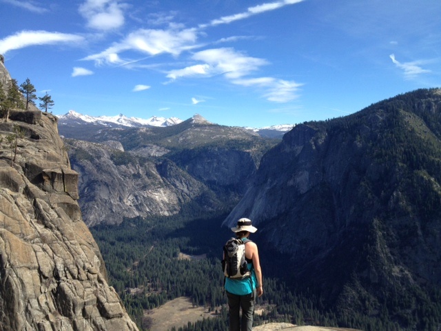 The Mrs. scrambling toward the edge, Yosemite Valley far below.