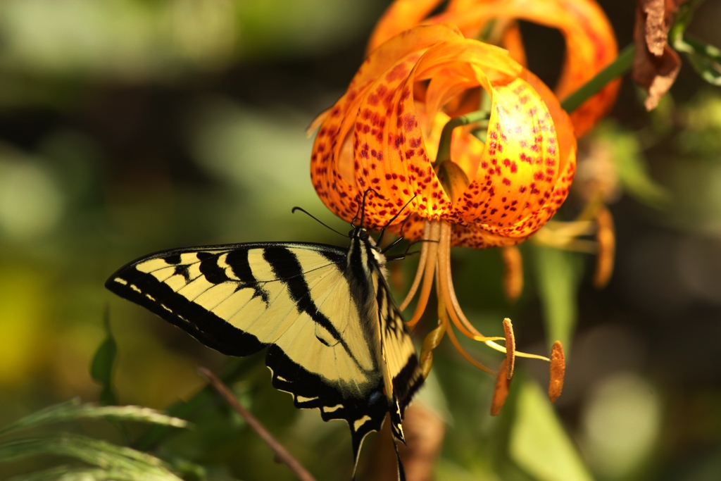 Then on my way down the creek I took a wrong turn, just a few feet the wrong way into the bushes, really. Turning back I found the path I had intended to follow a few steps later and a lily came into view, which I had not seen on my way up the creek. I stopped to take a gander and a tiger swallowtail butterfly fluttered down onto the bloom.