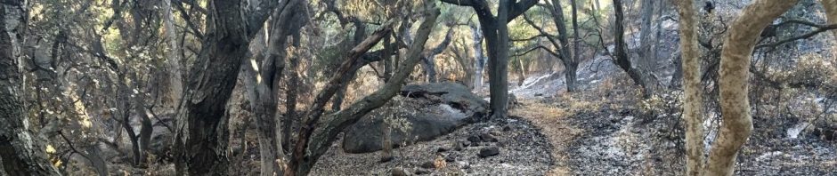 In a few places the unburned trail disappeared into large white patches of powdery ash where large oak trees had fallen and burned away, then it reappeared on the other side as a trail of unburned leaves and grasses surrounded by blackened, baked and crusty soil.