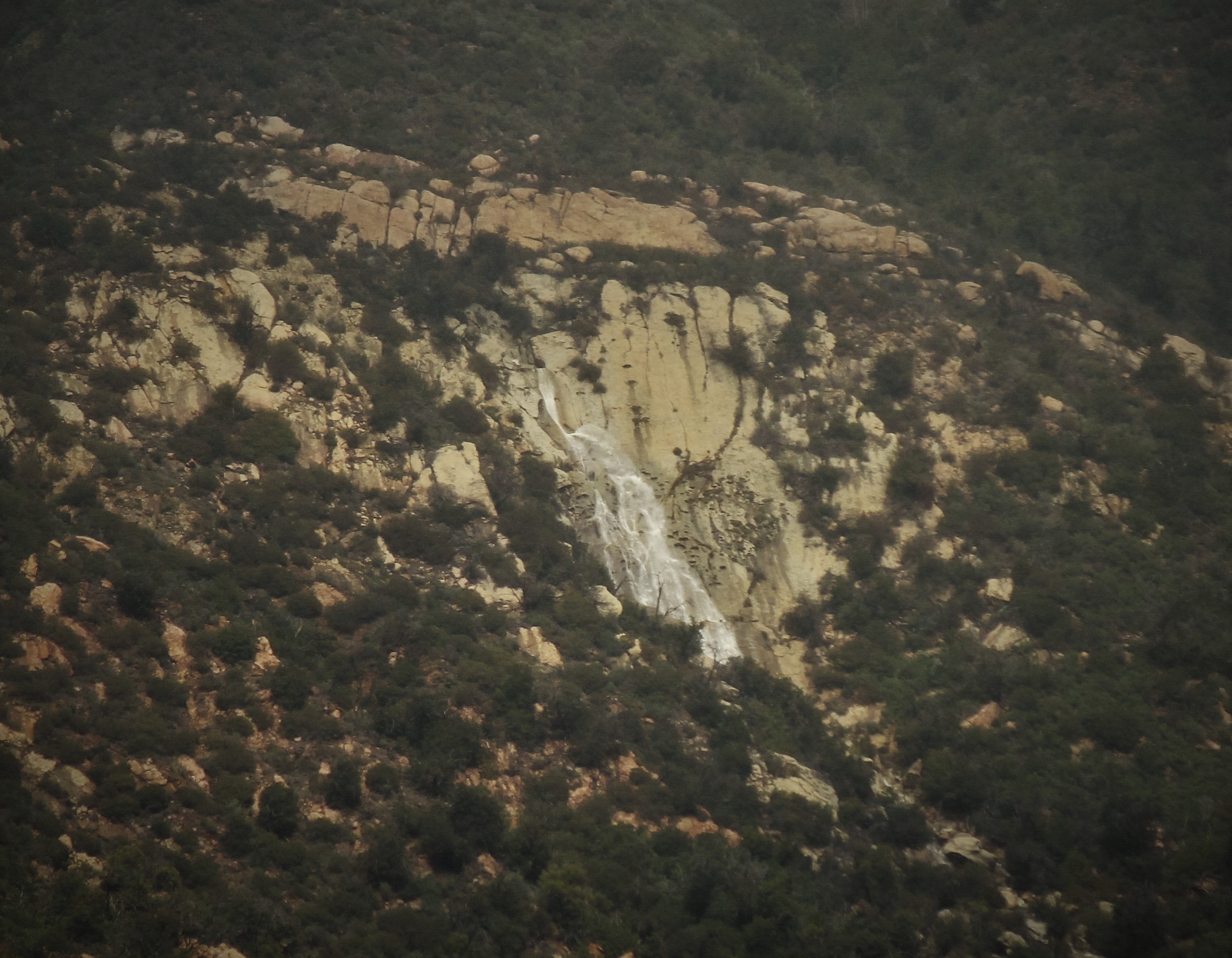“Out around Glen Annie and Cathedral Oaks if you look toward the Front Range after a pretty good rainstorm you can sometimes see a tiny little set of falls that has a vertical drop of circa 100.’ It is set against an outcropping of rock and drains a quite small drainage. With good optics, it will appear as just a small thread of sparkling water and, if the wind is blowing, mist.
