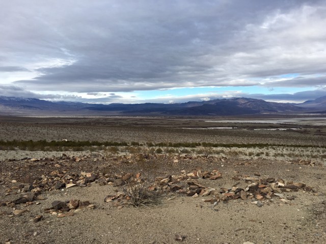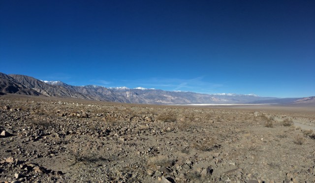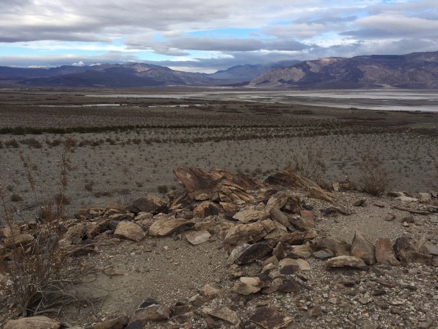 Looking toward the Ko’onzi village site, the salt flats of Saline Valley visible in the distance beneath the snow-capped peaks of the Inyo Range.