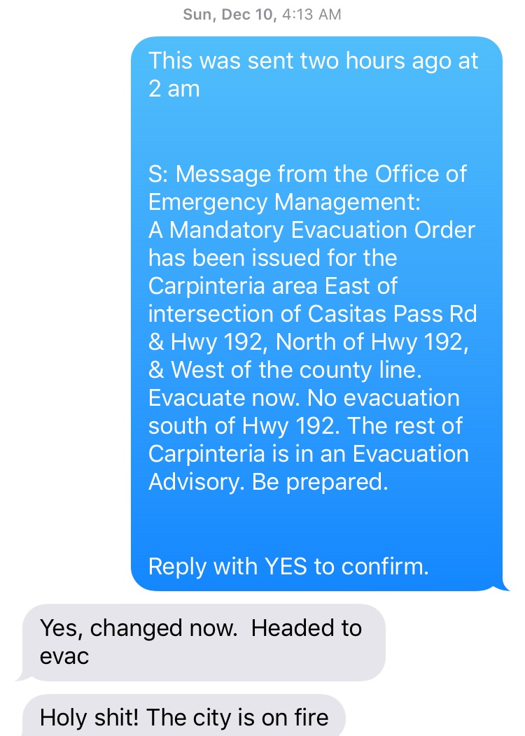 We had to evacuate at four in the morning at one point. Here is a text I sent my wife and her “Holy shit!” response: Mandatory Evacuation Notice.