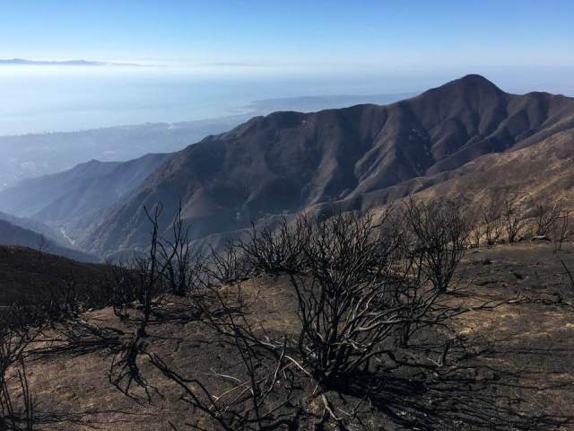 The Santa Ynez Mountains and San Ysidro Creek canyon above Montecito following the Thomas Fire, as seen on January 11. Montecito Peak is the prominent point seen frame right.