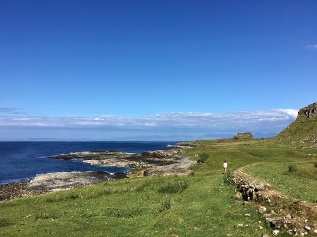 The trail down to the rocky headland Rubha nam Brathairean or Brothers’ Point begins from the paved road as a short gravel driveway leading to several cottages perched on the steep grassy hillside overlooking the ragged shoreline below.