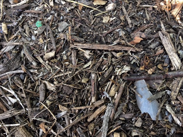 A snapshot showing plastic debris in the mulch. I walked out my back door, knelt down in a random spot in the garden, looked for just a second to spot some plastic, and took the photo. So pervasive is the plastic trash in the mulch that I can find it anywhere I kneel within seconds of looking without even digging.