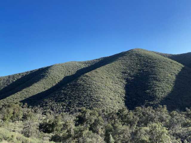 The smooth weathered slopes of chaparral carpeted hills along Sunset Valley.
