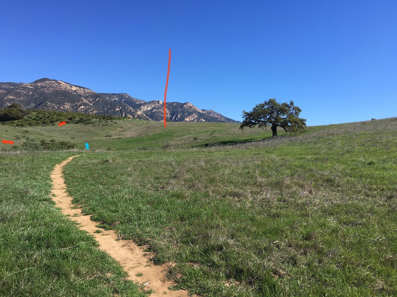 Looking over the spring denoted by the blue dot and onto bowling Spring Potrero noted by the large red line. The other two red slashes underline the course of the people’s path, hardly visible.