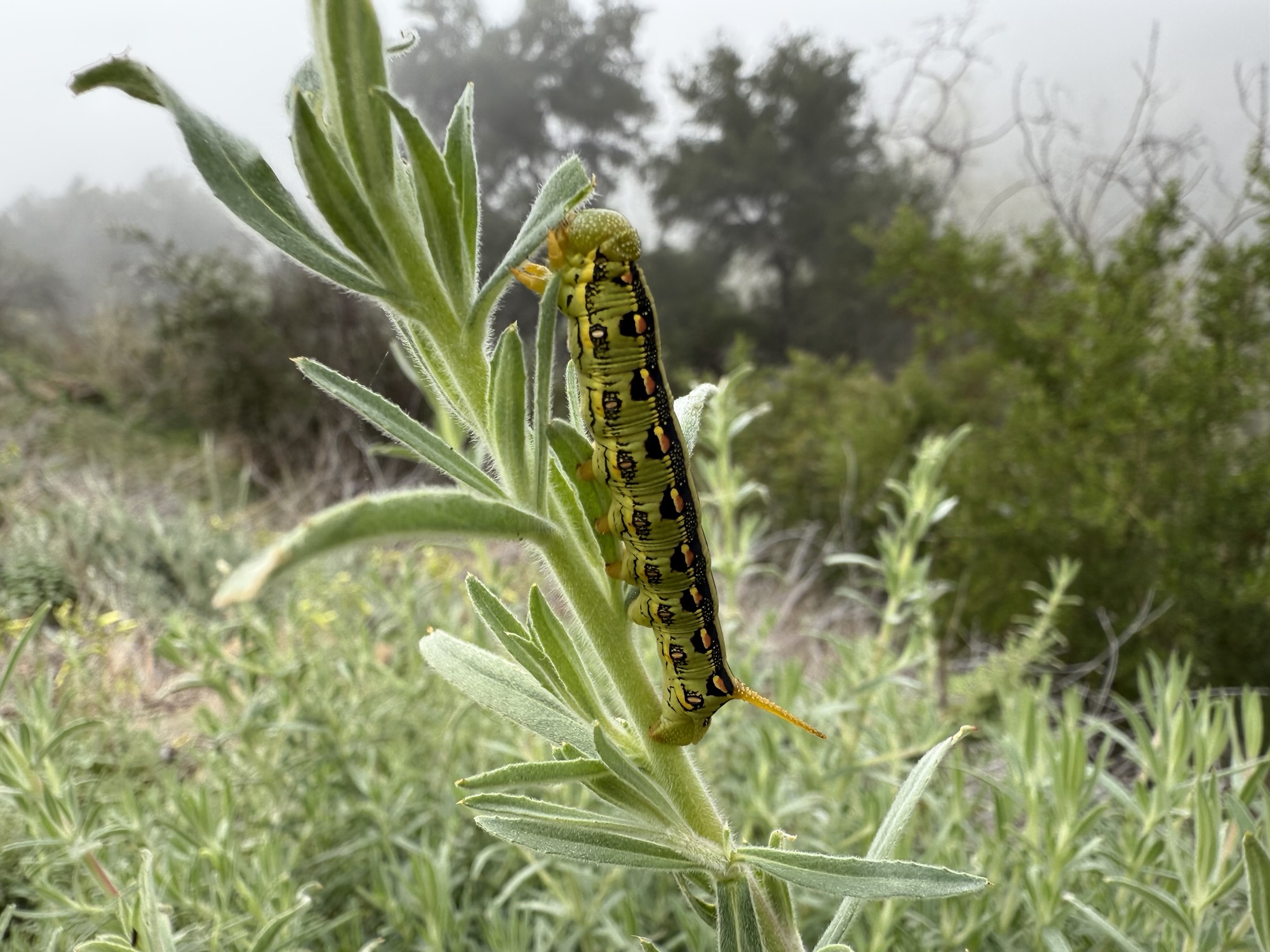 Hornworm, Manduca sexta, feeding on an unknown plant in the Santa Ynez Mountains of Santa Barbara County. (Spring 2025)