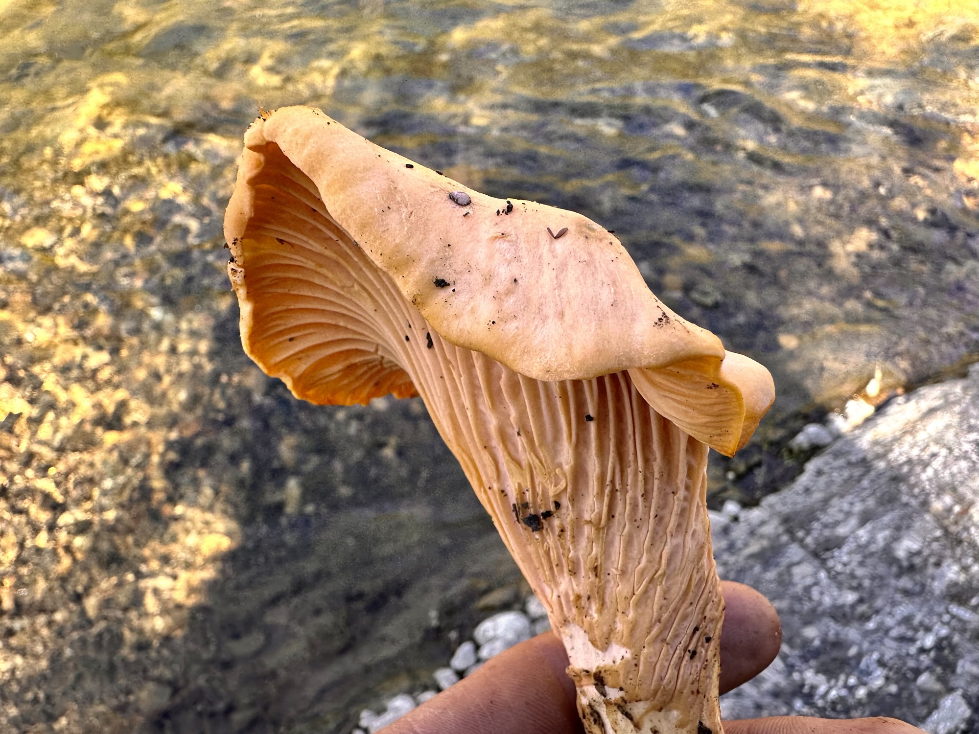 A chanterelle showing its defining feature of decurrent plicated ridges, which sets it apart from other similar looking, inedible and poisonous gilled mushrooms.
