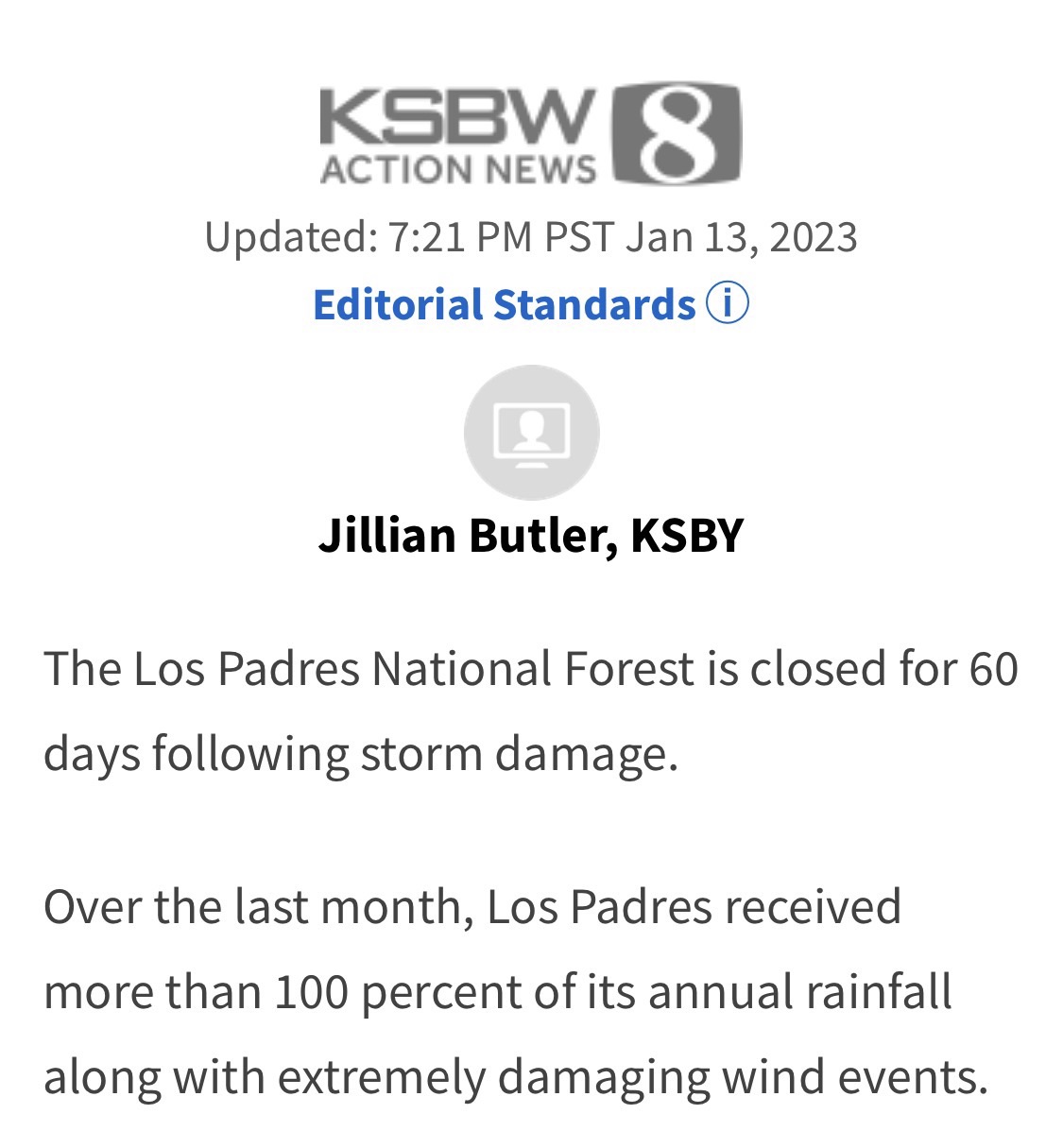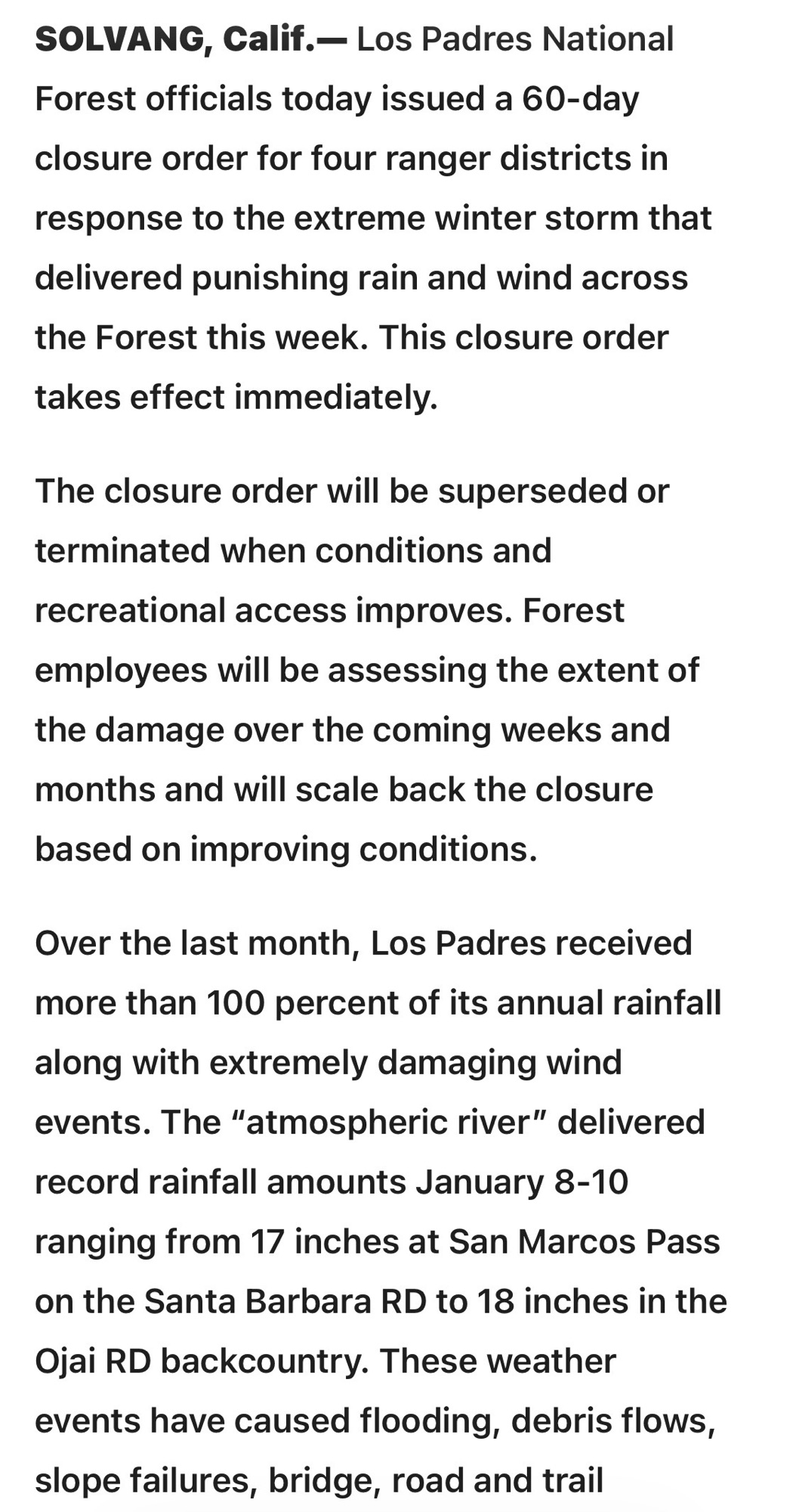 “Over the last month, Los Padres received more than 100 percent of its annual rainfall along with extremely damaging wind events.”