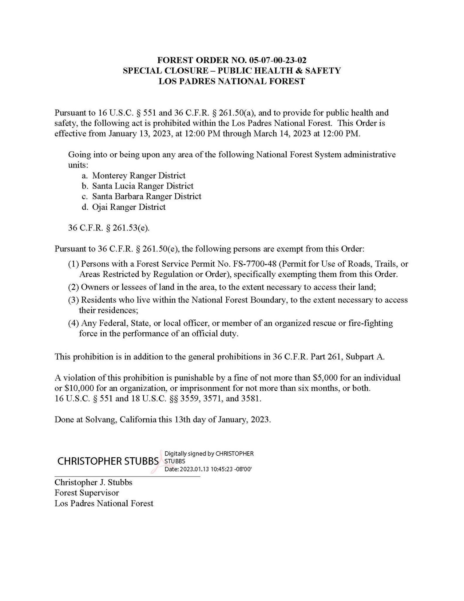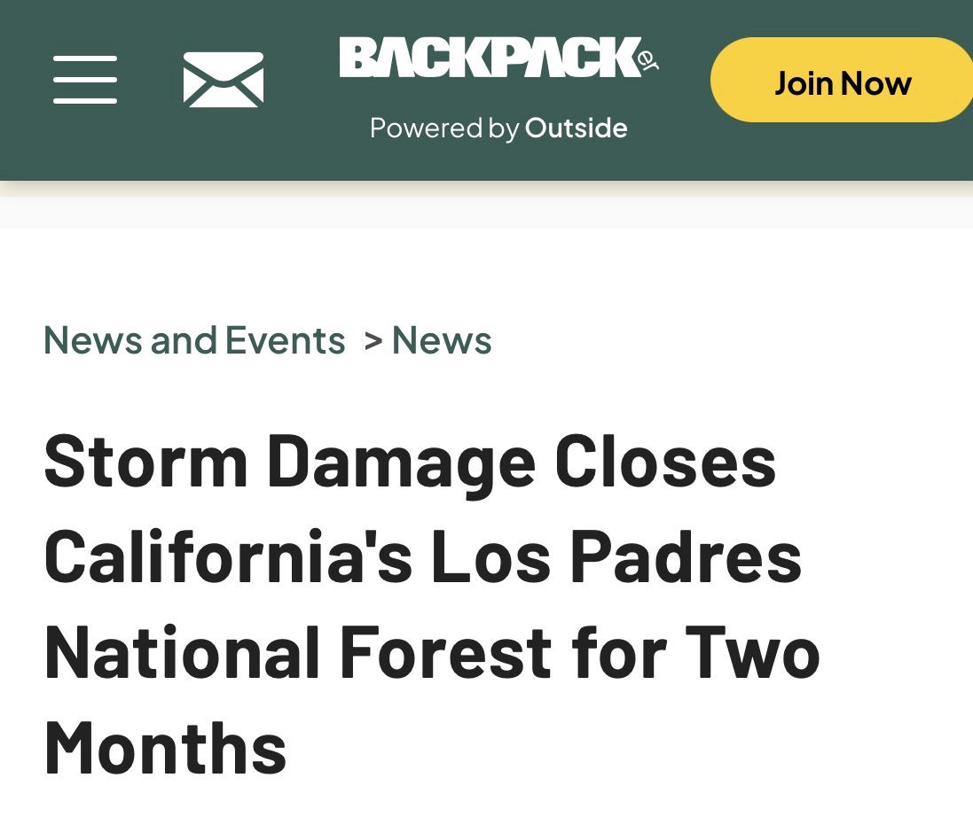 In 2023, after a series of torrential atmospheric rivers dumped historic rainfall, Forest Supervisor, Christopher J. Stubbs, issued a diktat closing Los Padres National Forest.