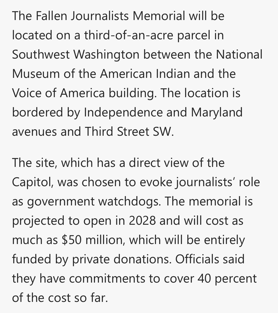 The site, which has a direct view of the Capitol, was chosen to evoke journalists’ role as government watchdogs.”